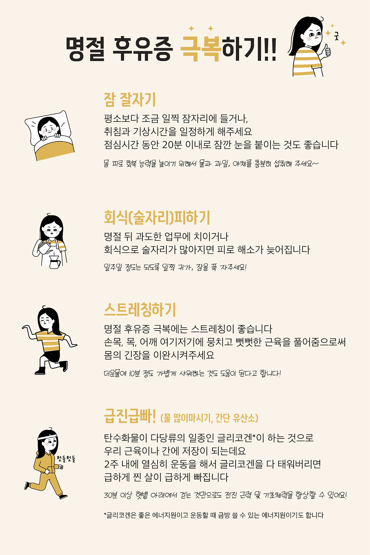 이제 후유증을 극복하기 위해 어떤 방법이 있는지 알아볼게요. 첫 번째로는 잘 자는 것 이에요. 충분한 수면은 회복에 큰 도움이 되죠. 낮잠을 짧게 자거나, 일찍 잠자리에 드는 것이 좋답니다. 두 번째로는 과식 피하기 입니다. 명절 음식이 맛있지만, 적당히 먹고 소화가 잘 되도록 도와주세요. 세 번째는 스트레칭 입니다. 근육 긴장을 풀어주면 몸이 한결 가벼워질 수 있어요.