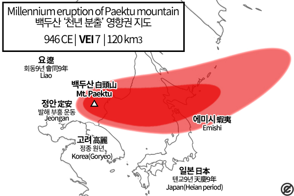 백두산의 가장 유명한 분화는 946년에 발생한 밀레니엄 분화인데요, 이때는 VEI(화산 폭발 지수)가 7에 이르렀어요. 이 분화로 인해 한반도 및 일본, 중국 북부 지역까지 화산재가 영향을 미쳤어요. 당시 분화로 인해 약 120km³의 물질이 분출되었다고 전해져요.