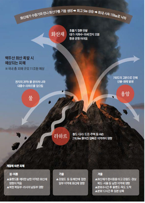 백두산이 분화하면 가장 큰 피해는 화산재에 의한 것이에요. 화산재는 천천히 떨어지더라도 대기 중에 오래 머물 수 있어요. 이 화산재는 농작물에 큰 피해를 주고, 대기 오염을 일으킬 수 있어요. 또한, 분화 시 발생하는 유황산화물(SO2)과 이산화탄소(CO2)로 인해 환경에 심각한 영향을 미치게 돼요.