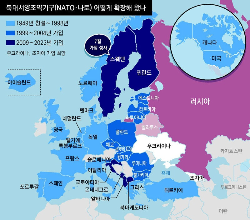 나토의 확장을 보여주는 지도 이미지로, 유럽의 안보 환경 변화를 시각적으로 나타내고 있어요.