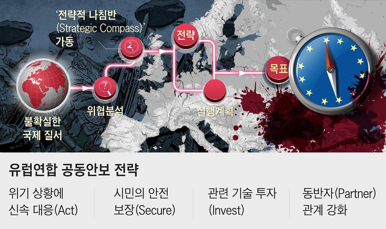 유럽안보협력의 '전략적 나침반' 개념을 보여주는 이미지로, 유럽의 안보 목표와 전략을 강조하고 있어요.