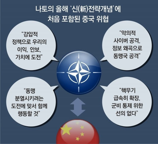 나토의 새로운 전략 개념을 보여주는 이미지로, 중국을 위협으로 포함한 내용을 강조하고 있어요.