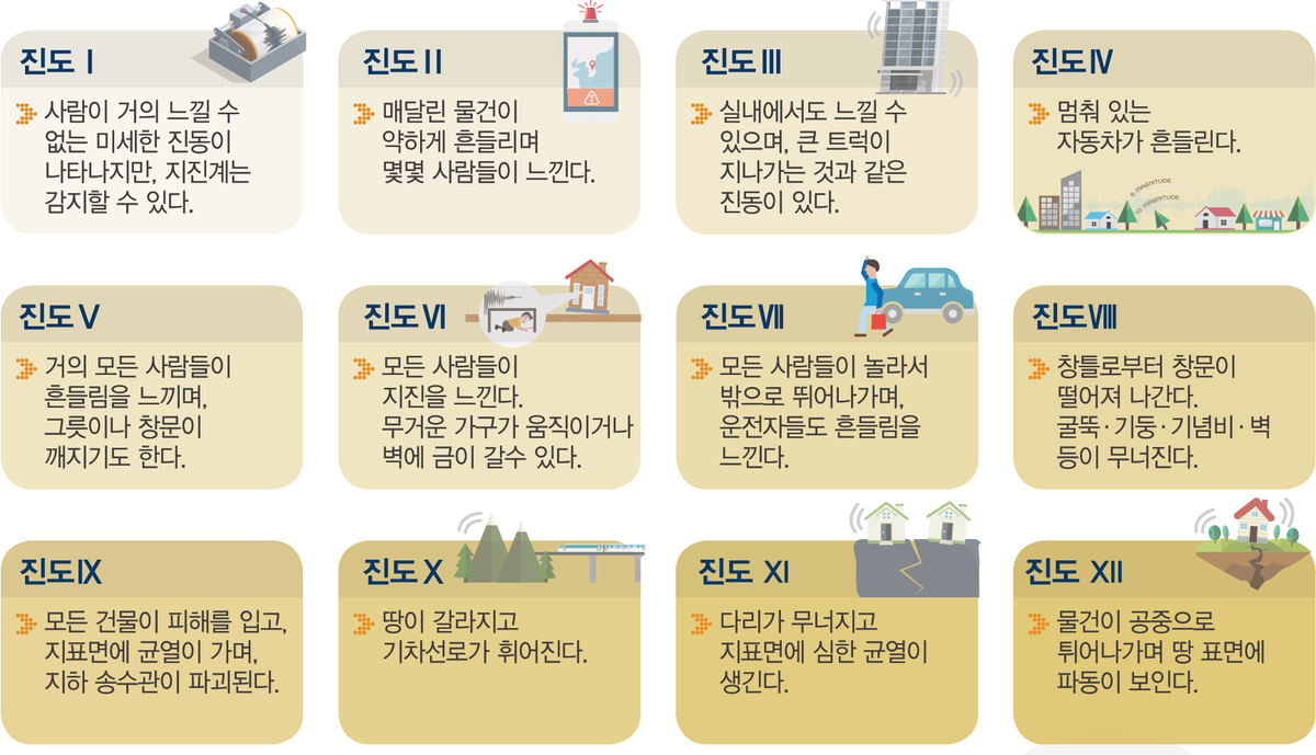 지진 진도는 보통 1등급부터 12등급까지 나뉘어요. 각 등급별로 사람이나 건물에 미치는 영향이 다르답니다.