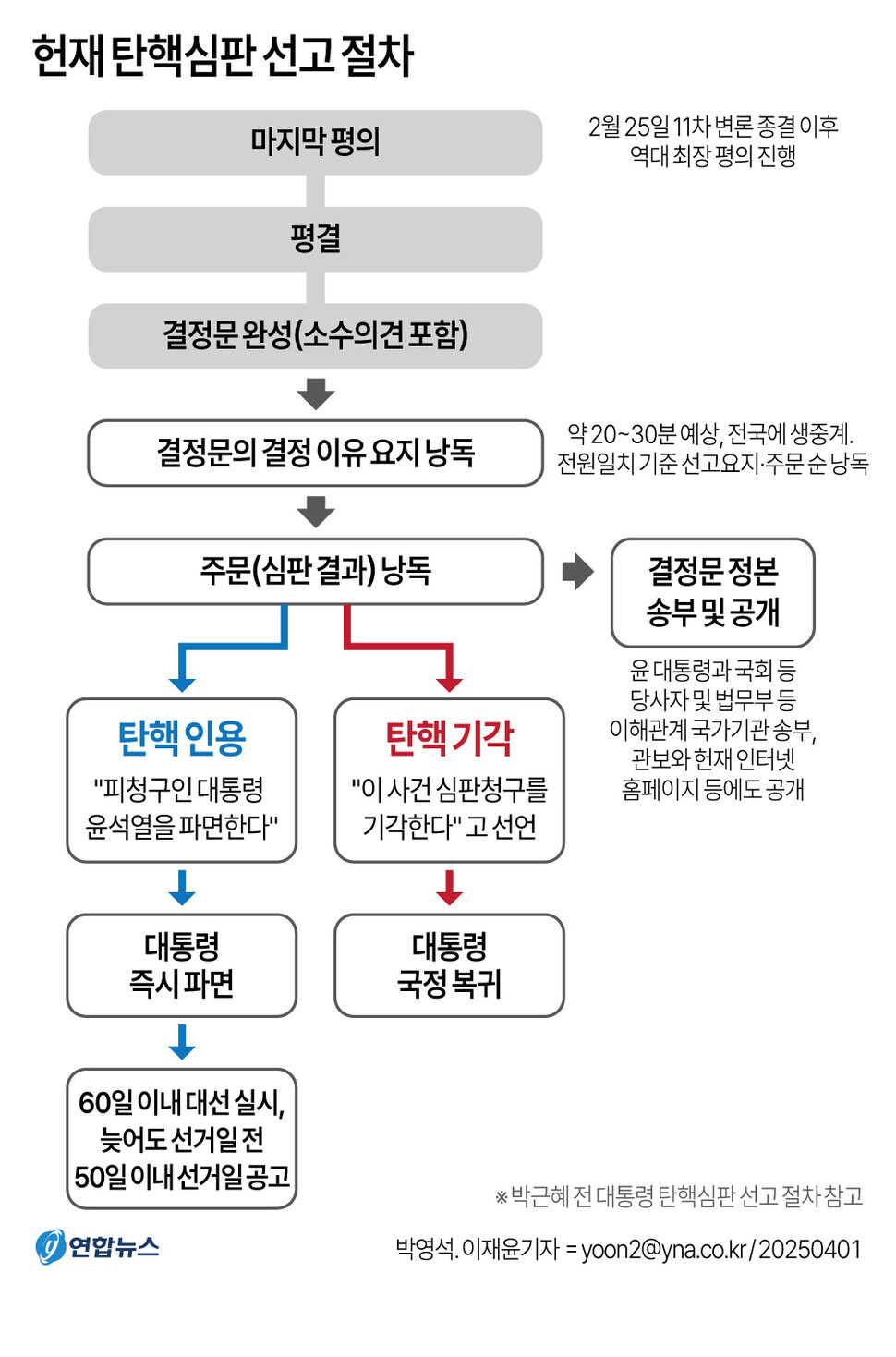 [2] 한겨레 - 4월 탄핵 선고 3가지 시나리오…윤석열 파면·복귀, 아니면 ... (https://www.hani.co.kr/arti/society/society_general/1189537.html)